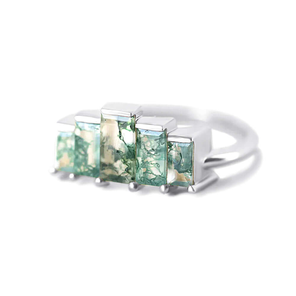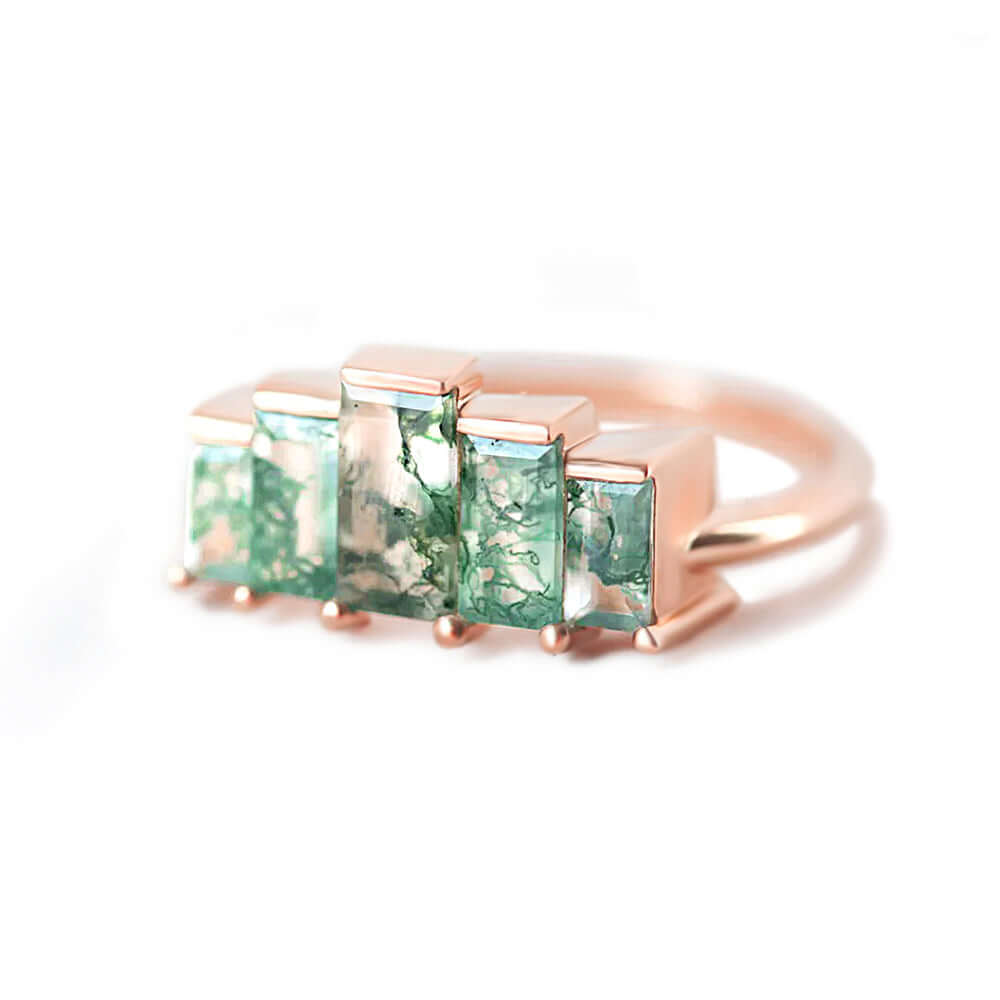 Embrace the nature-inspired jewelry trend with our ring, a stunning, art deco-inspired masterpiece. Custom-cut baguette moss agate gemstones adorn this exquisite piece, complemented by an optional lace band available for purchase separately to complete the enchanting engagement ring set.