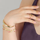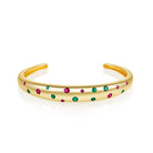 Scattered gemstones in luscious ruby-red and sparkling emerald-green hues bring a burst of vibrancy, while the sleek gold-tone finish exudes a polished and luxurious look. Its minimalist yet bold design makes it ideal for elevating both casual and formal outfits with ease.