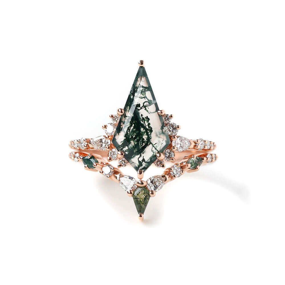 This unique engagement ring with Moss Agate is perfect for your special day. The accent diamonds lovingly highlight the piece's elegance. For added allure, you can pair this ring with a stunning kite-cut band, continuing the moss agate and diamonds design. Together, these two pieces create a set that is perfect for any occasion.