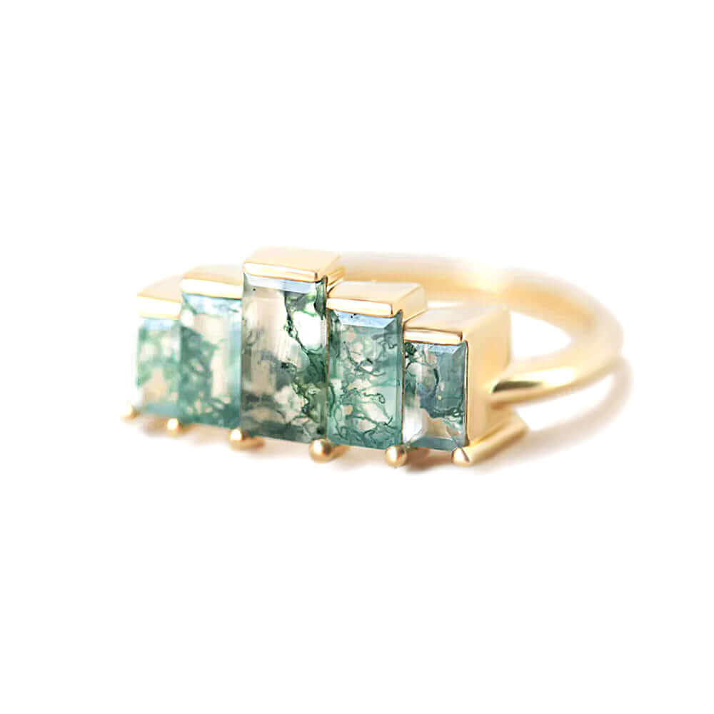 Embrace the nature-inspired jewelry trend with our ring, a stunning, art deco-inspired masterpiece. Custom-cut baguette moss agate gemstones adorn this exquisite piece, complemented by an optional lace band available for purchase separately to complete the enchanting engagement ring set.