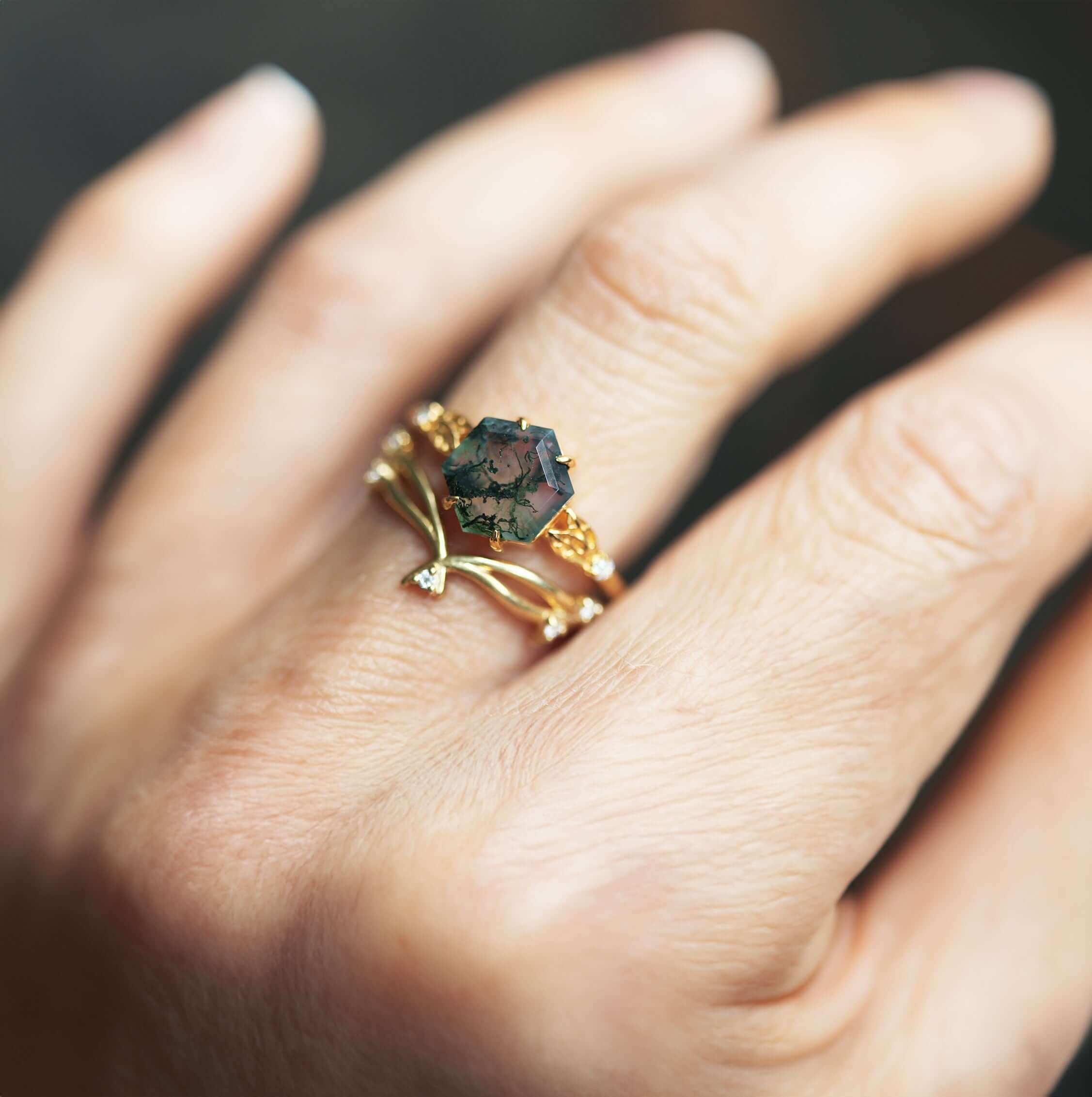 Discover the unique allure of our geometric hexagon moss agate side stone ring. The leaf-detailed band beautifully complements the intrinsic beauty of the moss agate. Ideal for nature lovers, this ring is a perfect choice for you or your fiancé.